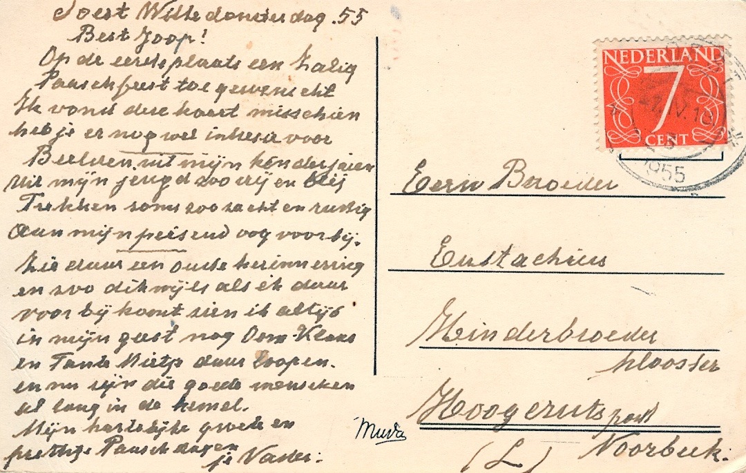 Een ansichtkaart met aan de voorzijde een foto van het Tolhuisje in Baarn. De kaart is geschreven door F.J. Kiet selaer en verstuurd aan Joop(br.Eustachius)Kietselaer.