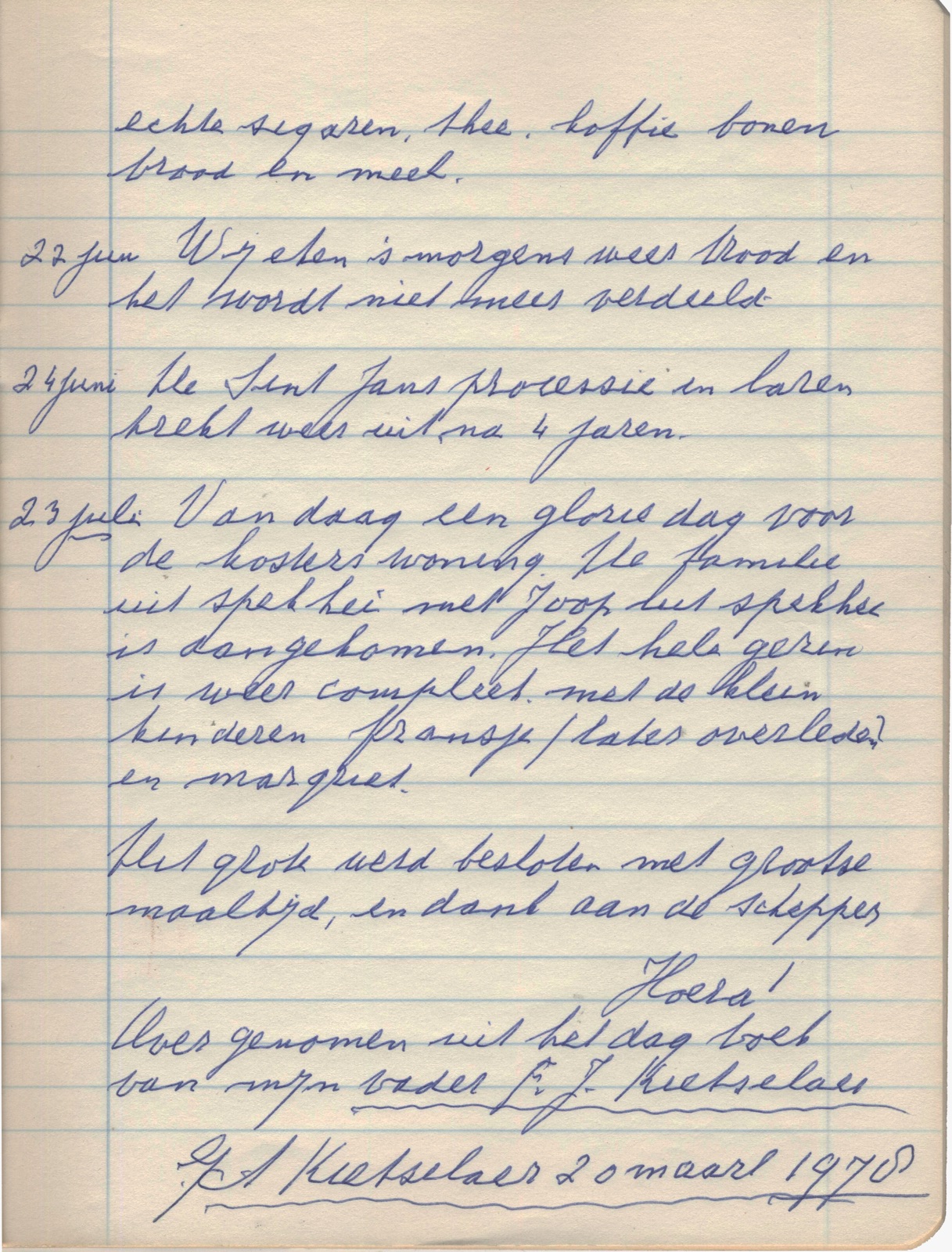 Een waardevol document dat een erg goed beeld geeft van het gezinsleven in de laatste dagen van de tweede wereldoorlog. Links onderin vind je enkele pagina’s van originele dagboek van Frans Kietselaer en de herschreven versie door Bertus Kietselaer.